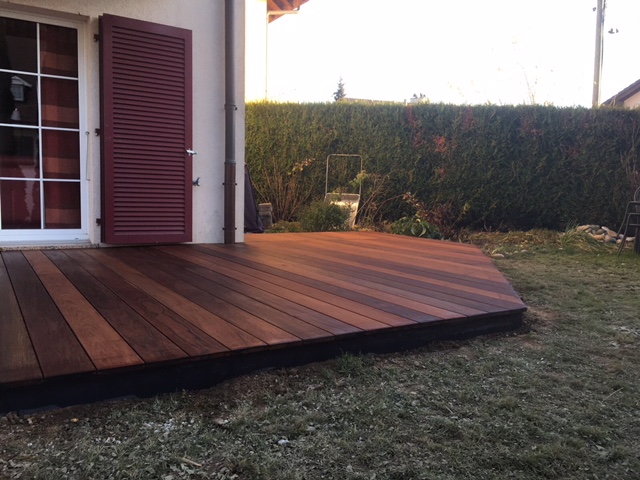 Création d’une chape en béton et pose d’une terrasse en bois.